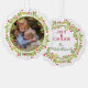 Une carte de Noël classique contemporaine ornée de baies orange et rouge rose, complétée par des feuilles de couronnes dans les tons clair et vert foncé. Il offre un espace pour personnaliser le texte, le nom de famille et l'année, ainsi que l'option d'ajouter une photo personnelle choisie sur le devant. Le dos de la carte est conçu pour un message de salutation saisonnier personnalisable.