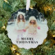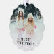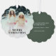 Carte de voeux de vacances moderne qui peut aussi être utilisé comme un tag cadeau et un ornement de papier arbre. Le recto présente votre photo superposée avec "Joyeux Noël" en typographie élégante. Sur le dos, personnalisez votre salutation, vos noms et votre année en simple typographie sur un arrière - plan vert sauge foncé.