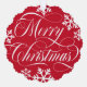 Belle carte de décoration de Noël Joyeux en rouge avec des flocons de neige blancs, un script tourbillonnant, et de l'autre côté une photo de votre famille avec votre nom de famille et l'année.