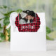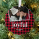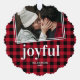 Carte de décoration classique de Noël avec une photo de famille avec un design blanc contemporain 2 bordures, un fond rouge & noir plaid, le beau mot "joyful" dans une police élégante, vos noms, et année.