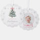 Celebrate a sweet First Christmas with this delicate paper ornament card featuring a snowy evergreen tree, soft silver snowflakes, and a charming blush pink bow. The scalloped shape and photo-backed design create a keepsake look that families will treasure year after year. Perfect for gifting, hanging on the tree, or sending as a thoughtful holiday card.