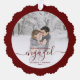 Commémorez votre fiançailles avec cette belle carte d'ornement de gardien. Le texte bordeaux dit "Notre premier Noël engagé", avec le mot "engagé" dans un élégant script d'écriture manuscrite avec des fioritures avant et après. Remplacez l'exemple d'image par votre photo préférée, et ajoutez vos noms et l'année. Un filtre en dégradé blanc permet de faire apparaître le texte. La conception apparaît des deux côtés de la carte.