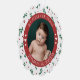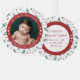 Présentez votre nouveau bébé avec un joli ornement photo de Noël de bébé avec une photo ronde de votre bébé avec texte courbé et un joli motif rouge et verdoyant et de coeurs mignons. Ajoutez les noms et les statistiques de naissance de votre bébé de l'autre côté. Poids, hauteur, date et heure de naissance.