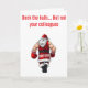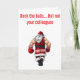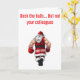Apportez un peu d'humour impertinent de vacances à vos salutations avec cette carte ludique ! Avec le texte en gras « Décorez les salles, mais pas vos collègues », ce design montre une scène malicieuse où un Père Noël de dessin animé assomme accidentellement (ou peut-être pas si accidentellement !) un de ses lutins. C'est une variante légère et ironique du stress des fêtes, parfaite pour les collègues, les soirées de bureau ou toute personne qui apprécie un bon rire pendant la saison des fêtes. Répandez la bonne humeur, les rires et un peu de malice inoffensive avec une carte qui ne manquera pas de se démarquer !