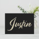 Une carte personnalisée belle et noble / carte de vœux / carte cadeau / carte d'anniversaire avec design d'écriture main en or blanc liquide pour Justin.