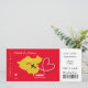 Une faire-part de mariage amusante mais élégante dans un style carte d'embarquement/billet pour les couples se mariant en Chine qui est montré dans une silhouette carte sur rouge, avec coeur d'amour doux, silhouette d'avion et forme de coeur tourbillonnant L'inverse a un espace pour votre photo et contact/RSVP détails sur un joli motif oriental or et fleurs de cerisier rose