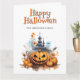 Bonne carte Halloween avec un citrouille éffrayant, manoir hanté et un fantôme avec un jack-o-lanterne à l'intérieur. Personnalisez facilement cette carte d'Halloween avec votre nom de famille et votre texte.
