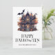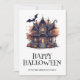 Carte d'Halloween avec une maison hantée, citrouilles et chauves-souris. Personnalisez facilement cette carte d'Halloween aquarelle avec votre nom de famille et votre texte.
