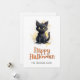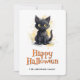 Bonne carte Halloween avec une aquarelle illustrant un chat noir. Personnalisez facilement cette jolie carte d'Halloween pour les enfants avec votre nom de famille et texte.