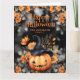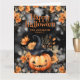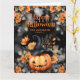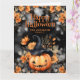 Bonne carte Halloween avec un citrouille souriant orné de fleurs orange. Un fantôme avec un jack-o-lanterne à l'intérieur. Personnalisez facilement cette jolie carte d'Halloween avec votre nom de famille et votre texte.