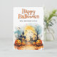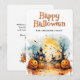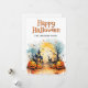 Joyeuse carte Halloween avec des illustrations d’aquarelle d’un cimetière hanté, jack o’lanterns et chauves-souris. Personnalisez facilement cette carte d'Halloween éffrayante avec votre nom de famille et votre texte.