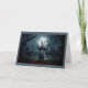Cette carte d'Halloween présente un design délicieusement effrayant et fantaisiste qui est sûr de capter l'attention. La figure centrale est un lapin à l'air menaçant avec des yeux rouges brillants et des crocs pointus, debout et levant ses pattes comme s'il était prêt à bondir. Le lapin est placé sur un fond sombre et sinistre de cimetière hanté, avec des arbres tordus et nus, une pleine lune qui jette une lueur sinistre, et des chauves-souris volant dans le ciel nocturne.