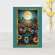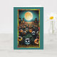 Cette carte d'Halloween présente une scène éffrayante et festive sous une pleine lune éclatante. Au premier plan, un rassemblement de citrouilles sculptés, chacun avec un visage unique et sinistre, semble prendre vie. Les citrouilles ont des expressions animées, allant des grins espiègles aux regards sinistres, ajoutant une atmosphère ludique mais éffrayante. L'arrière - plan présente un paysage hantant avec des silhouettes foncées d'arbres et de vieilles maisons mystérieuses aux fenêtres éclatantes, ajoutant à l'ambiance sinistre de la nuit.
