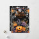Belle carte d’Halloween avec un jack-o’lanterne portant un casquette de sorcière noir et des fleurs violettes et oranges. Personnalisez facilement cette carte d'Halloween avec votre nom de famille et votre texte.