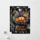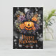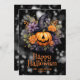 Bonne carte Halloween avec un citrouille en casquette noir et orné de fleurs violettes et oranges. Personnalisez facilement cette carte d'Halloween avec votre nom de famille et votre texte.