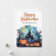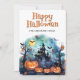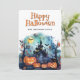 Joyeuse carte Halloween avec des illustrations aquarelle d'un manoir hanté, chauve-souris, jack o’lanterns et un cimetière. Personnalisez facilement cette carte d'Halloween éffrayante avec votre nom de famille et votre texte.