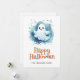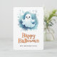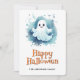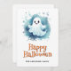 Bonne carte Halloween avec une aquarelle illustrant un joli fantôme souriant. Personnalisez facilement cette carte d'Halloween pour les enfants avec votre nom de famille et texte.