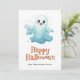 Carte Happy Halloween avec aquarelle illustrant les fantômes et les citrouilles. Personnalisez facilement cette jolie carte d'Halloween pour les enfants avec votre nom de famille et texte.