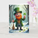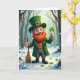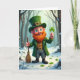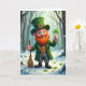 Cette carte de vœux représente un lutin joyeux debout dans une forêt recouverte de neige, ses yeux verts brillants et ses joues roses mis en valeur par une barbe orange flamboyante. Il porte un manteau émeraude et un haut-de-forme assorti avec de légers motifs de style celtique, ainsi qu'une boucle dorée qui accroche la lumière douce. Dans une main, il tient un trèfle à trois feuilles ☘️ comme s'il l'offrait à quelqu'un juste à l'extérieur de la scène, et dans l'autre, il saisit un petit balai rustique comme s'il venait de dégager un chemin pour un ami. Derrière lui, des arbres nus se fondent dans des bleus et des blancs pâles, avec une légère brume ou chute de neige suspendue dans l'air. De petits trèfles verts 💚 pointent à travers la neige autour de ses bottes noires robustes, ajoutant un contraste doux au sol hivernal. Le texte de vœux se trouve près du haut en lettres vertes, avec