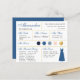 Une carte d'information classique de femme de ménage bleue et or, avec des informations sur la date et l'emplacement du mariage, les couleurs mariages, la fête de la mariée, la robe de femme de ménage et un message de proposition de femme de ménage. Le nom de la demoiselle d'honneur et les titres sont écrits dans un script bleu élégant. Dans le coin inférieur droit, il y a une robe bleue. Au centre, il y a les couleurs mariages en cercles : 3 nuances de bleu, rose roux et or. Les couleurs, y compris la couleur de la robe mariage, peuvent être changées, à l'exception du cercle d'argent, qui est fausse feuille d'or.