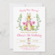 La carte d'invitation d'anniversaire de fille de Pâques présente un lapin mignon avec des feuilles d'eucalyptus et des fleurs roses. Ce design est idéal pour quelqu'un qui organise une fête d'anniversaire sur le thème du lapin.