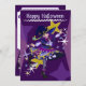 Jolie sorcière Neko Halloween sur une carte de fête violette au recto. Le texte d'invitation pouvant être personnalisé par les clients figure au verso.