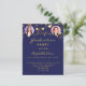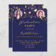 Une carte d'invitation élégante pour une fête de remise de diplôme en 2025 (ou toute autre année) pour lui et elle. Un fond bleu marine orné de fausses étoiles dorées. Personnalisez et ajoutez 2 photos, un nom et les détails de la fête. Fonctionne mieux avec des photos carrées. Le texte Remise de diplôme et le nom sont écrits avec un style d'écriture manuscrit moderne. Texte de couleur dorée.