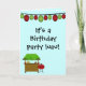 Cette invitation de fête d'anniversaire de carte de voeux est luau party conçu. Sur la couverture, des lanternes rouges et vertes sont accrochées au sommet, une cabane en tiki et un barbecue au fond. "C'est un luau de fête d'anniversaire !" est écrit au milieu. Vos informations personnalisables sur la partie se trouvent à l'intérieur. com