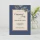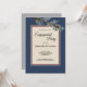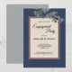 Cette carte d'invitation pour la fête de fiançailles Pine Blue Winter combine une bordure encadrée bleue poussiéreuse, élégante et formelle, avec des branches de pins élégantes et persistantes pour un look classique mais rustique. Le feuillage botanique vert avec une typographie calligraphique sur un fond beige crée une ambiance axée sur la nature pour une célébration de mariage de Noël ou de destination forestière.