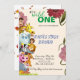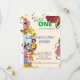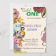 Le sauvage un - mignon animal sauvage créé la carte d'identification de premier anniversaire. couleur rose clair arrière-plan avec un flacon de fleur un côté autre cartton animal sauvage semble si belle carte d'invitation.