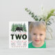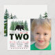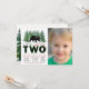 Cartes d'invitation pour l'anniversaire des 2 ans d'un garçon avec des sapins verts et un ours avec photo. Cette carte d'invitation pour les 2 ans avec un ours mignon de la forêt est facilement personnalisable pour votre événement en ajoutant simplement vos informations et votre photo.