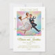 Image drôle d'un couple nouvellement marié tenant un balai et une poêle qui sont jetés en l'air après avoir sauté joyeusement. Une invitation à une carte pour sauver la date avec une touche d'humour.