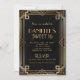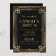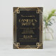 Invitation pour un Sweet 16 sur le thème des années 1920 avec décoration Art déco noire et dorée. Découvrez nos cartes de réponse et de réception assorties.