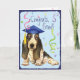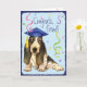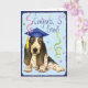 Félicitez votre diplômé préféré avec un cadeau comportant Basset Hound mignon et heureux licencié en portant une taloche parmi une bourrasque des confettis.