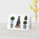 Cette papeterie présente un portrait aquarelle d'un chien Doberman Pinscher assis entre deux topiaires de style chinoiserie.