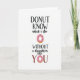 This greeting card features a white background with a sweet message running down the center. The text reads “DONUT KNOW what i do WITHOUT a daughter like YOU,” stacked in a tall layout from top to bottom. “DONUT KNOW” and “WITHOUT” are in thick, black block letters, while “what i do” and “a daughter like” appear in a softer, cursive-style script. The word “YOU” stands out near the bottom in warm brown block letters. Two donuts take the place of the letter “O,” and they look golden-brown with pink frosting and small dark sprinkles. The donuts add a cute, affectionate touch that fits the loving note to a daughter ❤️