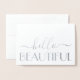 Envoyez des notes élégantes pour toutes les occasions avec de belles cartes de notes pliées en feuille d'argent Hello Beautiful. Tout le texte de ce modèle est simple à personnaliser ou à supprimer, et les styles de police peuvent être modifiés avec l'outil de conception Zazzle. Le design chic moderne minimaliste présente une véritable feuille métallique argentée sur le devant, un script de calligraphie élégant et une typographie de style art déco vintage. Ces cartes personnalisées élégantes peuvent être personnalisées en tant que notes de remerciement, cartes "pensées pour vous" ou pour tout autre usage de votre choix.