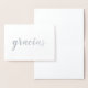 Cette belle carte en feuille d'argent a le mot espagnol "gracias" dans le script brush (brushstroke). L'intérieur de la carte est vide pour votre message personnel. Parfait pour chaque fois que vous souhaitez remercier quelqu'un pour un cadeau ou une gentillesse. Aussi disponible en feuille d'or.