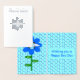 Cette superbe carte d'anniversaire en papier d'aluminium présente une image graphique d'un mignon bourdon bleu avec des rayures bleu vif, des yeux noirs, des antennes bleues et des pattes noires. Il possède de jolies ailes bleues et blanches. L'abeille est assise au milieu d'un joli tournesol bleu. La fleur a une tige verte et trois feuilles. Le message "Bee Day boy" apparaît sur les trois feuilles. L'arrière - plan est composé d'un motif peigne bleu pâle.