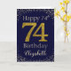 Joyeux Anniversaire avec simulé numéro d'parties scintillant doré 74 sur bleu violet foncé et encadré de faux diamants et de strass. Joyeux anniversaire et nom des destinataires en caractères blancs. Personnalisez avec le nom ou le message.