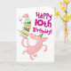 Un joyeux cochon sur une carte d'anniversaire. Utilisez "Personnalisez ce modèle" et changez l'âge pour créer une carte unique et customisée. Une carte avec un cochon brillant, sous un gâteau de couche de teetering avec des éclats de glace verte et surmonté de bougies roses.