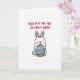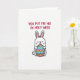 Cette carte montre une simple illustration numérique d'un lapin blanc centré sur un fond blanc brillant, contourné en noir avec des yeux souriants doucement fermés, des joues roses et des moustaches fines 🐰. Ses longues oreilles s'inclinent vers le haut avec l'intérieur d'un rose pâle, lui donnant un air doux et affectueux comme s'il se penchait pour une étreinte amicale. Le lapin enroule ses bras autour d'une grande forme ovale, la tenant près de lui comme un secret partagé entre amis. L'ovale est décoré de bandes horizontales ondulées de bleu ciel pastel, de rose doux et de jaune ensoleillé, ajoutant une douce atmosphère de Pâques 🌷. Près du haut, une ligne de texte espiègle indique « YOU PUT THE HO IN HOLY WEEK » en lettres majuscules. Le lettrage est d'un rouge profond et se trouve centré au-dessus du lapin