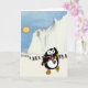 Un mignon pingouin de dessin animé dansant avec une écharpe colorée sur. Ses compagnons pingouins se promènent sur un terrain accidenté vers leur site de nidification dans la neige antarctique. Le pingouin devant vient de prendre sa retraite.