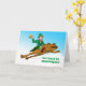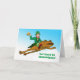 Qu'il y ait des shenanigans ! Carte de voeux amusante de la Saint Patrick avec un leprechaun tenant une bière et chevauchant une grenouille. La grenouille vole à travers le ciel bleu clair. Le leprechaun est habillé d'un costume vert, de bas rayés et porte un casquette vert. Copyright © Shoaff Ballanger Studios, 2024.