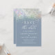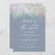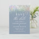 Parties scintillant bleu Dusty Mariage Enregistrer Les Cartes de Date comporte un arrière - plan bleu poussiéreux avec une parties scintillant irisée et votre personnalisation enregistrer les informations de date. Personnalisez avec votre texte en modifiant le texte dans les zones de texte fournies. Conçu pour vous par ©Evco Studio www.zazzle.com/store/evcostudio