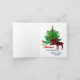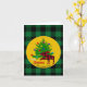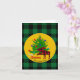 Cartes de vœux pliées festives rustiques avec élan et arbre de Noël, nom de famille personnalisé et signatures personnalisées soulignées d'un motif carreau de bœuf vert et noir.