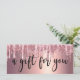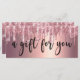 Ce magnifique design de certificat cadeau dispose de faux rose et cuivre rose or goutte parties scintillant texture métallique et élégante police calligraphie.