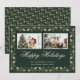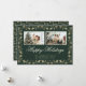 Carte de vacances élégante verte et dorée avec photo, avec du houx doré sur fond vert foncé. Personnalisez facilement cette carte de vacances photo avec vos photos préférées et le nom de la famille.