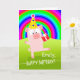 Cochon de fête dansante, carte d'anniversaire avec zone pour ajouter un nom sur la couverture. Peinture numérique avec arc-en-ciel coloré, cochon avec casquette d'anniversaire et cadeau, et herbe verte. Danse, danse, message de danse écrit à l'intérieur. Copyright © Shoaff Ballanger Studios, 2022.