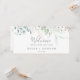 Cet en-tête de bienvenue spacieux et verdoyant est parfait pour un mariage moderne. L'élégant design botanique présente des eucalyptus aquarellés clairs et aquarellés, agrémentés de feuilles de parties scintillant en or blanc. La carte s'imprime à l'avant et à l'arrière (double face). Veuillez consulter la collection pour connaître les cartes de classement des sièges du numéro de table de coordination.